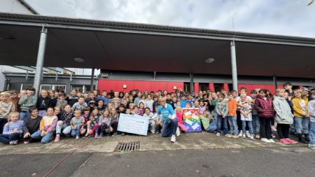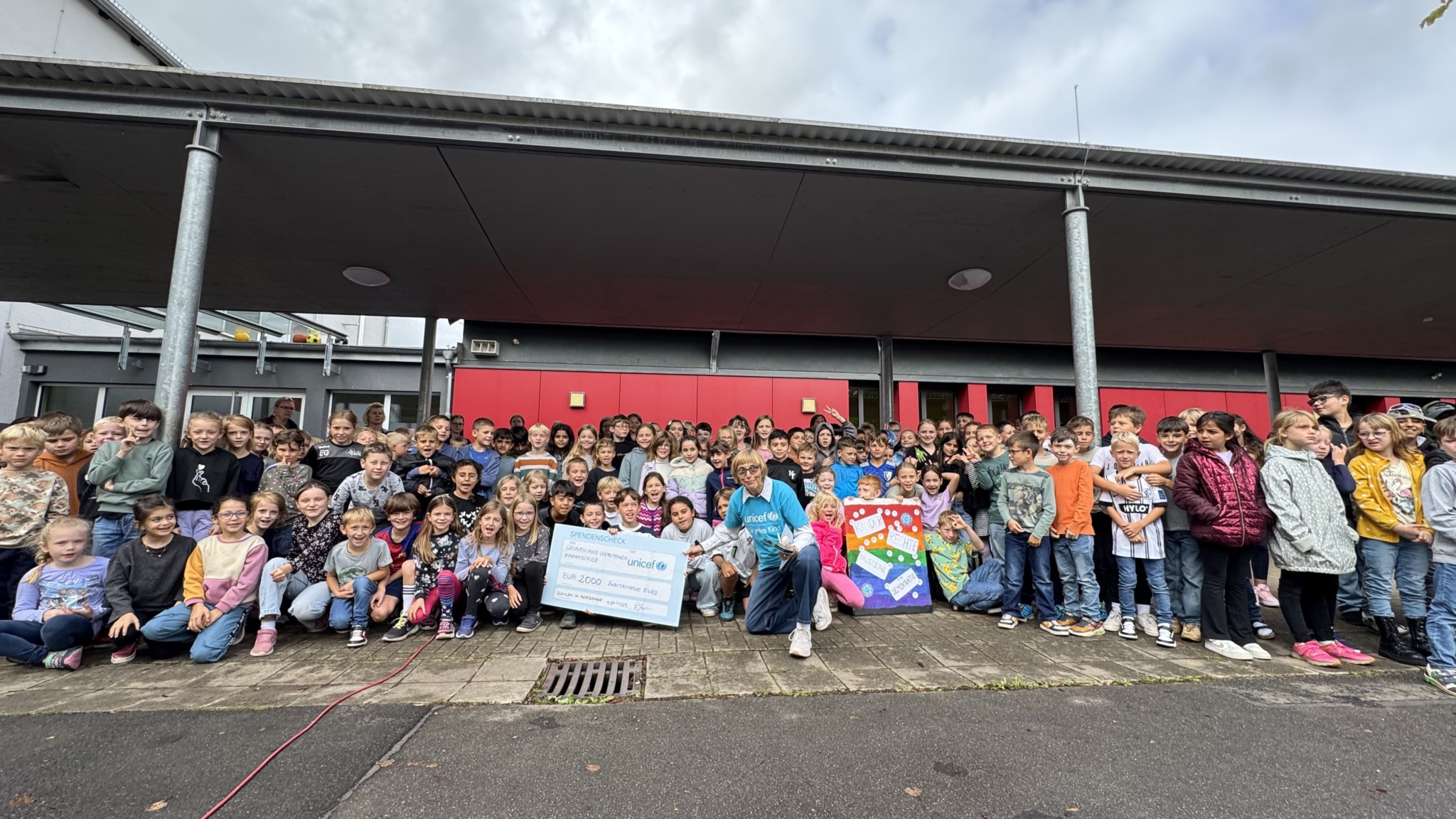 Am 11. September 2025 fand an der Grundschule Uchtelfangen gemeinsam mit der Kerpenschule eine feierliche Spendenübergabe statt. Frau Christiane Siewert, Vertreterin von UNICEF, nahm einen symbolischen Scheck in Höhe von 2.000 Euro entgegen.
